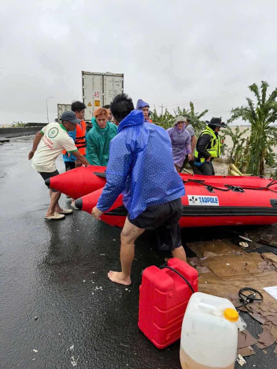 Đường chia cắt. Đoàn kẹt lại ở Sông Cầu suốt nhiều giờ. Người dân địa phương hỗ trợ chúng tôi dừng trú an toàn, ấm lòng vô cùng. 4 giờ sáng, khi nước bắt đầu rút, một số anh em trong đoàn đã đi gõ từng cửa xe phía trước để đánh thức tài xế, điều phối để mở đường cho cả tuyến dài phía sau. Đến An Phú (Phú Yên), nước dâng cao 3 mét. May mắn thay, đoàn được dừng tại khu đất cao cạnh hồ nước và Tịnh Xá Ngọc Bửu. Các thầy cho mọi người vào rửa ráy, trú tạm và trò chuyện để vơi đi lo lắng. Đêm ấy ngồi trên xe, nghe tiếng xe cứu thương hú xuyên màn mưa, ai cũng thắt lòng – lo cho bà con và cũng lo cho sự an toàn của chính mình.